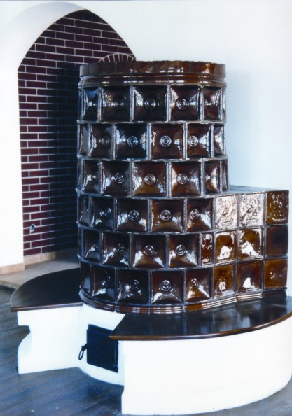 Hagyományos zöld szemeskályha - vöröskő lábazaton (Kővágóörs)